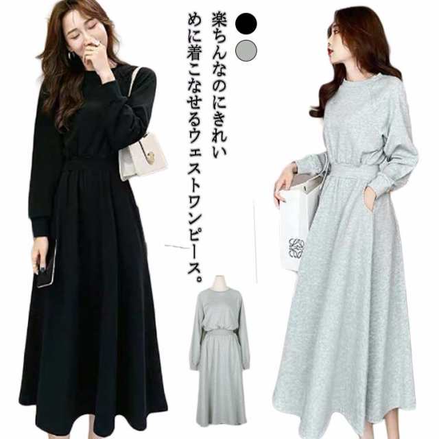 体型カバー ワンピース パーカーワンピース ハイウエスト マキシ丈 長袖 ワンピース トレーナー スウェットワンピース ポケット付き 丸首 脚が隠せる ウエストシェイプ スエット ワンピース ロング 春秋 送料無料 秋冬 楽ちん