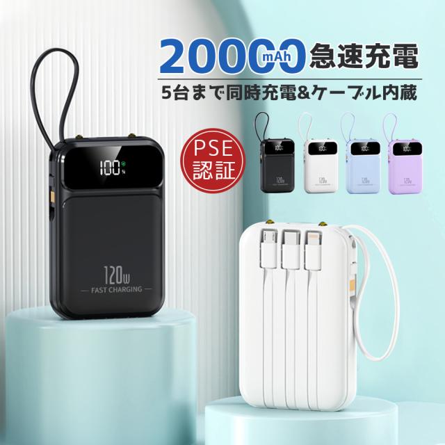 【TV・SNSで話題沸騰】モバイルバッテリー 20000mAh 大容量 ケーブル内蔵 5台同時充電 鏡面デザイン 軽量 小型 iPhone タイプc Type-C 災害用 停電対策 急速 スマホ 充電器 ケーブル不要 LEDライト 残量表示 持ち運び Android PSE認証済 アウトドア 旅行/出張/地震対策