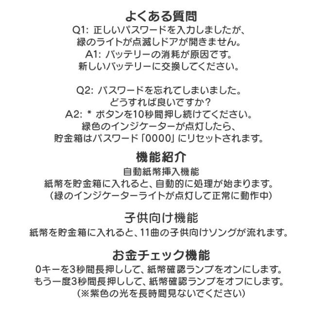 | 商品説明 | 【たくさんのギミックが面白い☆】 ・お子様から大人まで、みんなで楽しく貯金♪「電子貯金箱 金庫型」が登場。 【まるで銀行みたいな貯金箱】 ・貯金箱に見えない、可愛いデザインが魅力。オートマチック、暗証番号など銀行みたいな仕組み 【パスワード設定でしっかり管理】 ・自分だけのパスワードを設定できるので、安心して保管できる。 ・※初期パスワードは「0000」変更方法は説明書(英文表記)をご確認ください。 【自動販売機みたいにお金をIN】 ・コインもお札も入る作り。自動でお札を吸い込んでくれるから、本物のATMみたい! 【音楽が流れるギミックを搭載】 ・お札を吸い込む際に、楽しい音楽が流れる♪ランダム再生なので、飽きずにずっと楽しめる。 【貯金のモチベーションをUP】 ・ロック解除のギミック音も楽しいので、貯金箱を開けるときもワクワク♪ 【たっぷり入るサイズ感】 ・保管スペースは、お札を入れても安心の大きめサイズ。大切な手紙などを保管するのも◎ 【お好みのデザインをチョイス!】 ・可愛いアニマル達のデザインをご用意。ちょっとしたギフトにもオススメのアイテム。 ・※乾電池は別売りです。単三電池を3本使用。 |