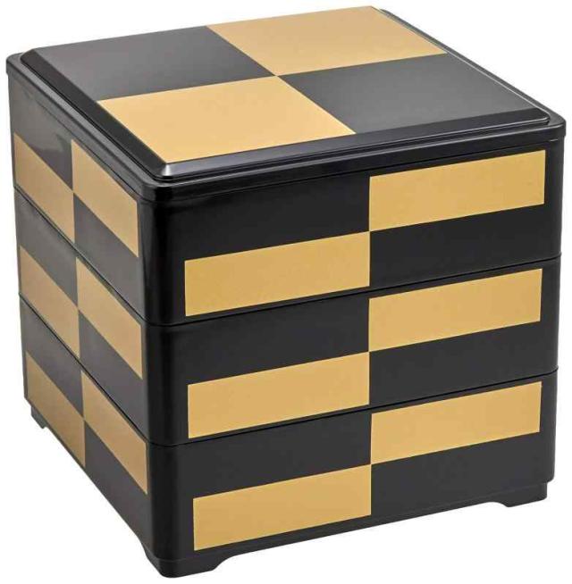 若泉漆器 3段重箱 6.5寸重 黒金市松(内黒) 深型 H-157-8A