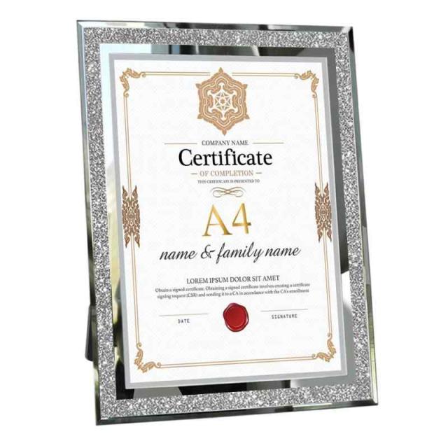 A: ガラス製でフレームはシルバーの縁がとてもオシャレ。ラメグリッターガラスの重なりがキラキラ輝き、写真をより一層華やかに見せてくれます。