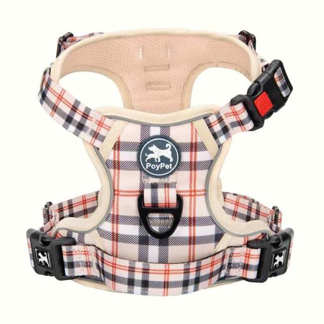 PoyPet 犬ハーネス 首が開けます 胴輪 大型犬 ソフト 安全 簡単着脱 咳き込み軽減 調節可能 反射材 引っ張り防止 車載功能 耐久性 老犬 歩行補助 しつけ用 (M, カーキ格子)