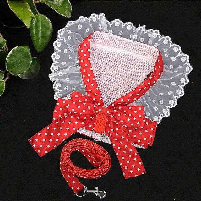 小型犬 犬猫用 ドット柄リボンレース付きリード一体型ハーネス (S, レッド)