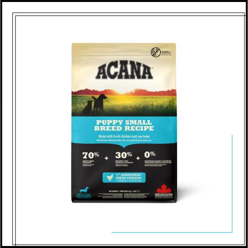 アカナ パピースモールブリードは地元の草原農場産の放し飼いコッブ種鶏肉、全卵、バンクーバー島産の天然カレイ、太陽の日差しを浴びて熟したオカナガンバレー産のフルーツと野菜をたっぷり使用しています。急速に成長する幼齢期の小型犬が必要とする高品質の動物性たんぱく質と良質な脂肪類を豊富に含む高栄養価タイプのドッグフードです。従来品と比較して肉原材料の種類・配合比率が向上しました。穀類、タピオカ、ジャガイモを一切使用せず、生物学的に適正なフードとして更なるグレードアップを実現しました。