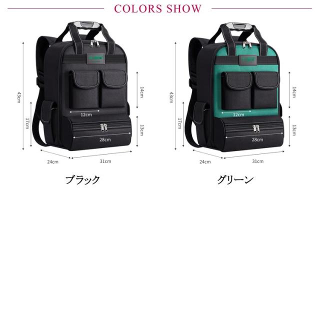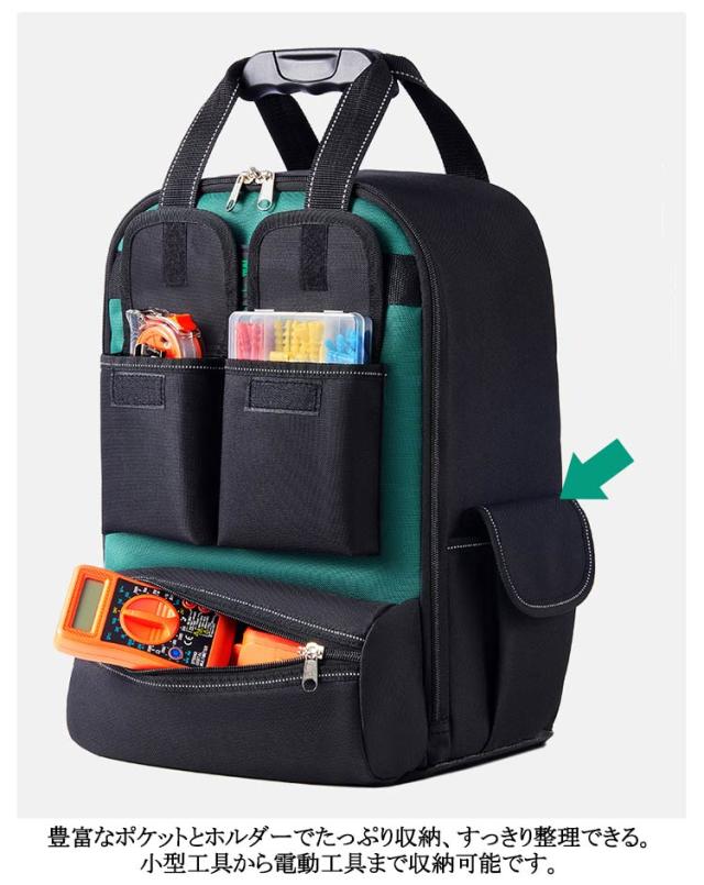 | 工具・道具・資材等の収納、持ち運びに便利なリュック型ツールバッグです。 リュックデザインなので、普通の手提げのツールバックに比べてより楽に持ち運びできる。 豊富なポケットとホルダーでたっぷり収納、すっきり整理できる。小型工具から電動工具まで収納可能です。 1680D高密度オックスフォードを採用しています。強化縫製でしっかりと仕上げられ、耐荷重、耐摩擦、耐久性に優れてます。 バックパネルやショルダーストラップは幅を広め、柔らかなパッドが付いて、優れた減圧効果があり、長時間に重い工具を負担しても疲れにくいです。また、通気性が高い、汗などを速やかに吸収できます。暑い日でも快適に背負います。 また底鋲付きで地面に置く時も汚れにくい。 ねじからドリル、ペンチ、スパナ、ドライバー、ハンマー、電動ドリルドライバーなど、小型工具から電動工具まで収納可能です。 電工、大工、木工、内装、電気工事、修理、配線、配管、建築、鉄工などを務める色々な職人に適用されます。 工事現場や建設現場などで使用するのがメインですが、DIYの広まりから一般家庭に使われるケースも多いです。 | |