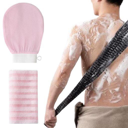 【製品仕様】セットにはボディータオル1つと垢擦りミトン1つが含まれます。タオルのサイズは105*25cm、重量約50g。お風呂手袋のサイズは14*21cm、重量約20gです。この角質除去タオルはピンクとブラックの2色から選べます。バスタオルは十分に長く、背中など手の届かない部分を簡単に洗浄することができ、折りたたみ可能で洗浄をより容易にします。手袋はさまざまな手の形に適応し、手首から滑り落ちるのを防ぎます。