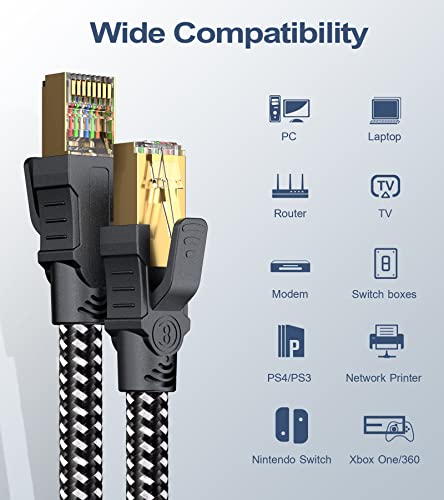 【広範な互換性】高速CAT 8イーサネットケーブルはCAT 7、CAT 6、CAT 5、CAT 5 Eケーブルなどと互換性があるだけでなく、iMac Pro、PS 3、PS 4、PS 4 Pro、Xbox、Xbox One、Smart TV、WiFiエクスパンダ、スイッチ、TP-Link、ビデオゲームコンソール、Raspberry Pi 4、TVデコーダ、WiFiルータ、PC、ネットワークプリンタ、メディアプレーヤー、テレビボックス、NAS、VoIP電話、フリーボックス、リアルタイムボックス、BTスマートハブ、バージンモデム、パッチパネル、Blu-rayプレーヤーなど、RJ 45コネクタを搭載したすべてのデバイス。