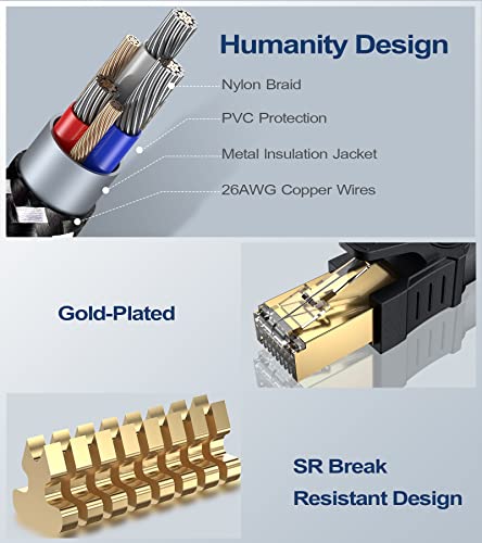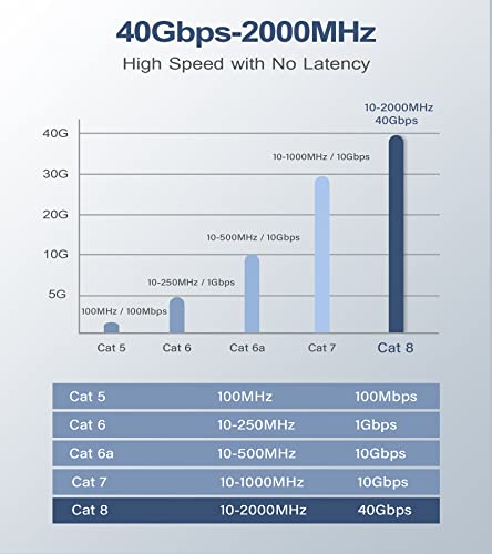 【40Gbps超高速】タブ:購入前に長さを確認する。このcat 8イーサネットケーブルは、40 Gbpsの速度と2000 MHzまでの周波数を提供します。CAT 8イーサネットケーブルは40 Gbps BASE-T標準をサポートし、10 Gbpsをサポートする標準CAT 7ケーブルより4倍高速である。データ転送タスクをシンプル化し、時間を節約します。