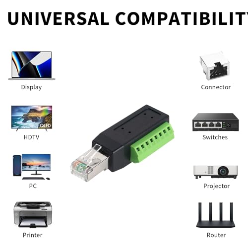 このアダプター・コネクターは、RJ45オスから8ピン・スクリュー・コネクターまで、信号の伝達において優れたシールド干渉防止機能、安定した安全性を備えています。