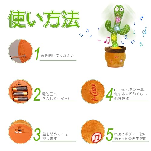 【使いやすい踊るサボテン】左のrecordボタン数秒間押して、「di」の音を聞くまで、それから自分の音を録音することができます。 話が終わったら、左ボタンを放してください。もう一度左ボタンを押すと録音が再生されます。右側のmusicボタン、1回押して曲を切り替えて、3秒長押しして