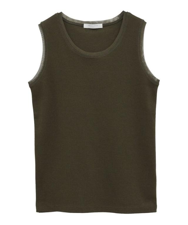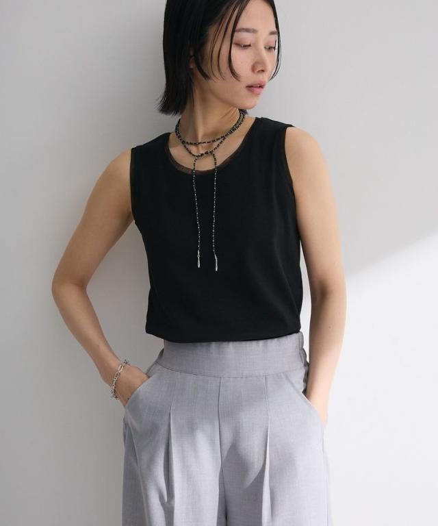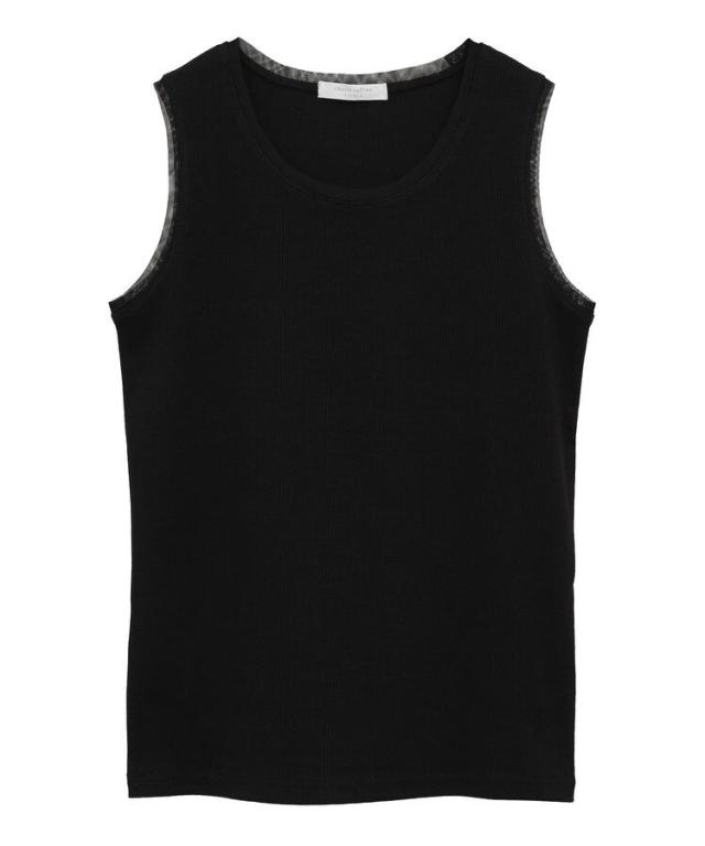 マルチユースに楽しめるリブタンクトップ。伸縮性に優れた生地とセミフィットのサイズ感で着心地良く仕立てました。ネックラインやアームホールのチュール素材が爽やかな着こなしを演出するアクセントに。メインではもちろん、ワンピースやシャツのインナーとしても活躍してくれるおすすめの1枚です。透け感[ややあり]