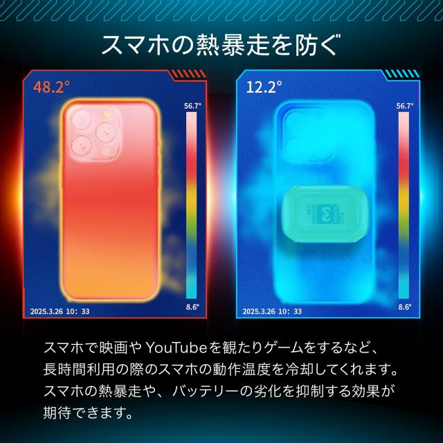 スマホで映画やYouTubeを観たりゲームをするなど、長時間利用の際のスマホの動作温度を冷却してくれます。