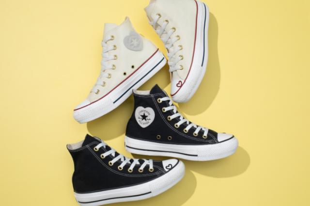 PLTS(プラットフォームソール)タイプをベースに、ハートモチーフをトウキャップとアンクルパッチに落とし込んだキュートなデザイン。