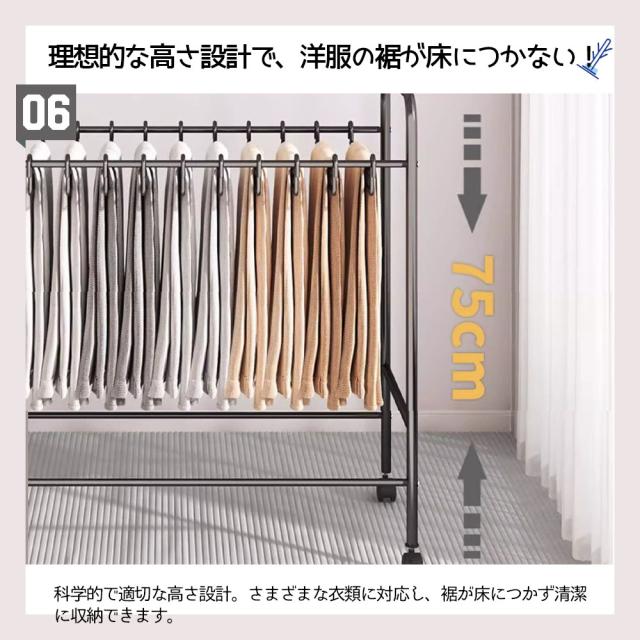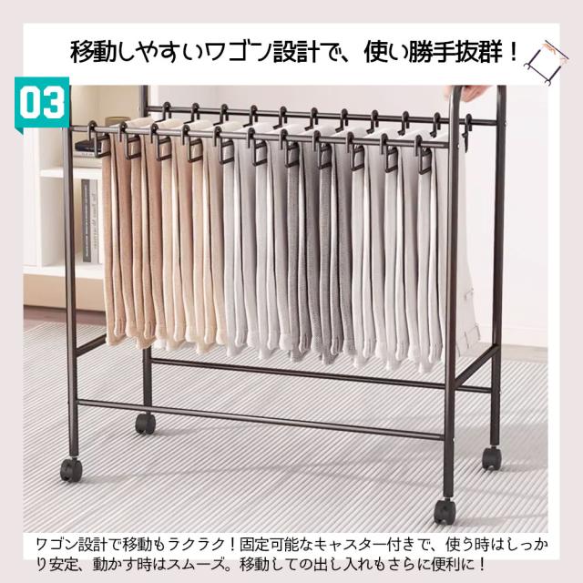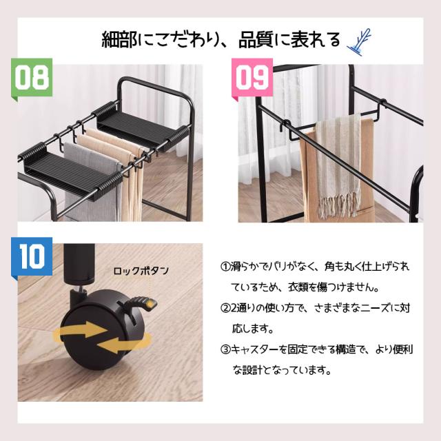 - 【キャスター付き】ハンガーラックにはキャスターがあるため、衣服をかけたままでも楽に移動ができ、衣替えやお掃除の時にも便利です。