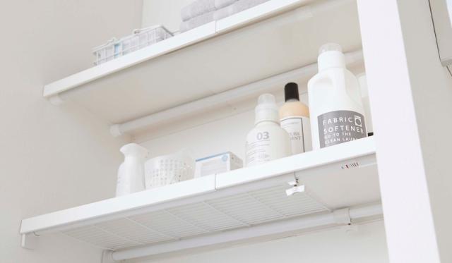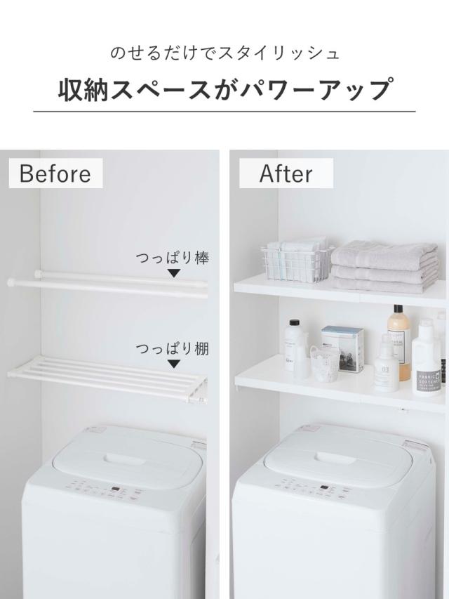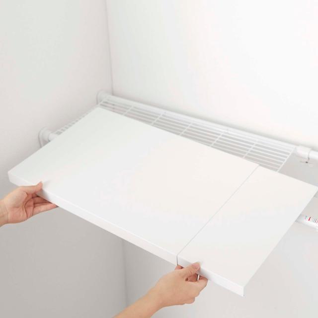 お手持ちのつっぱり棒やつっぱり棚の幅に合わせて上に置くだけで、簡単に棚を作ることができます。