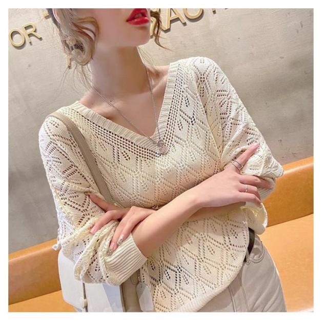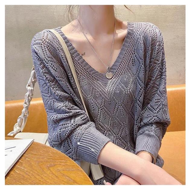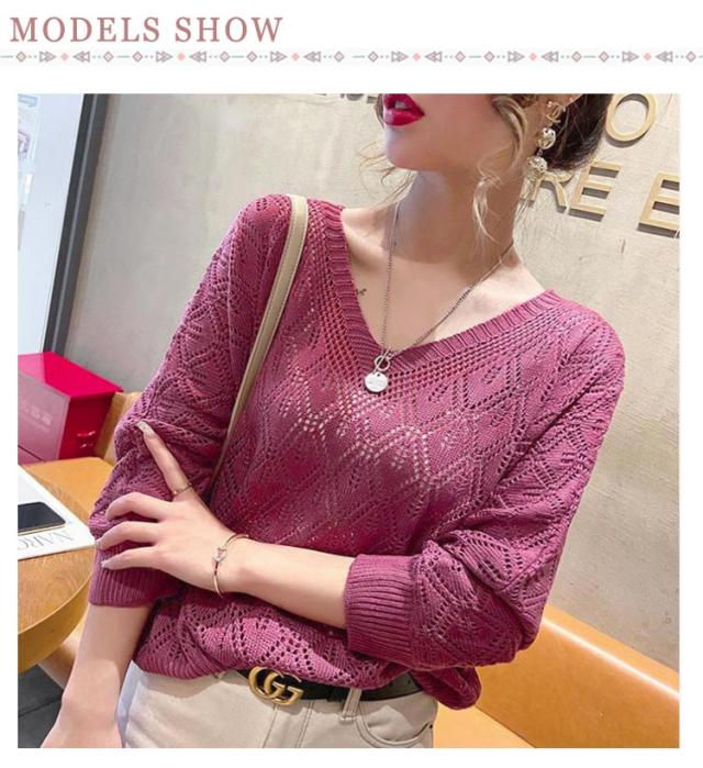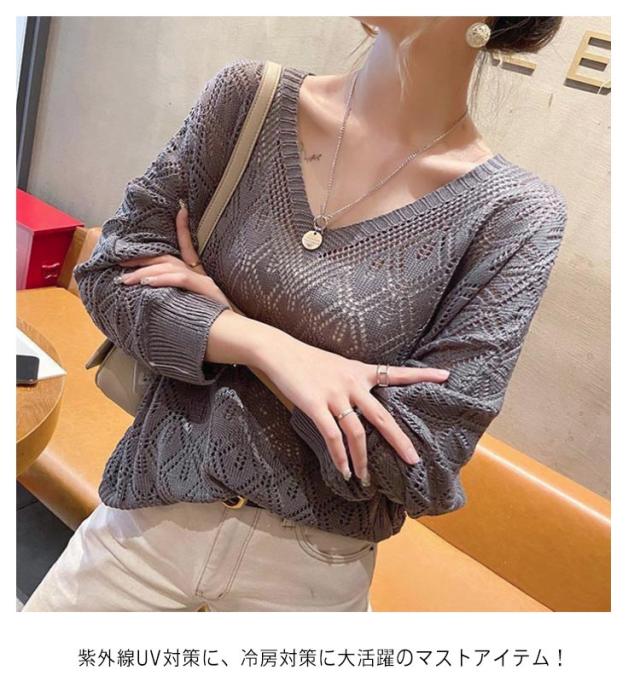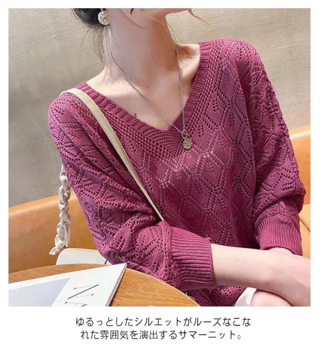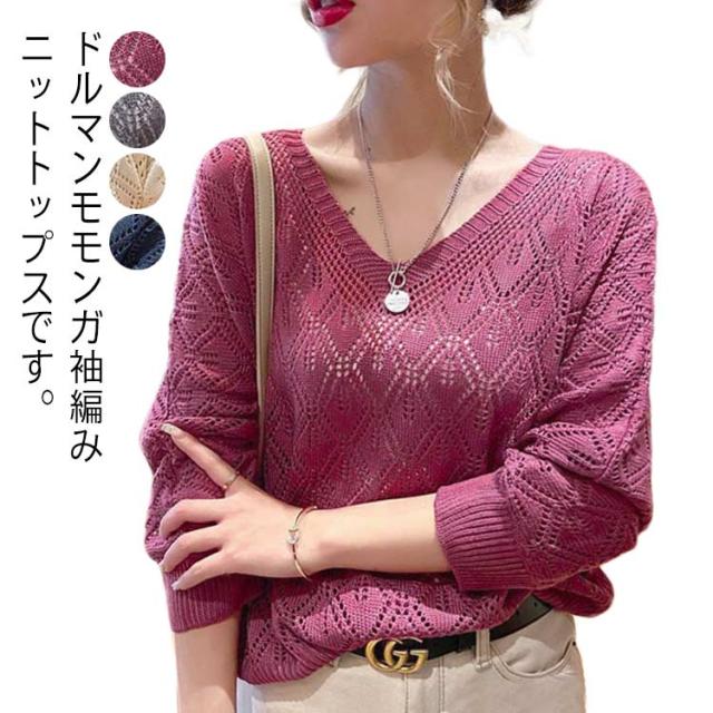 透かし編み トップス ニット 長袖 レディース レイヤード 夏ニット ドルマンスリーブ vネック 薄手 涼しい サマーニット カギ編み シアーニット 無地 プルオーバー シンプル 春夏 カジュアル 体型カバー 大きいサイズ ゆったり 送料無料