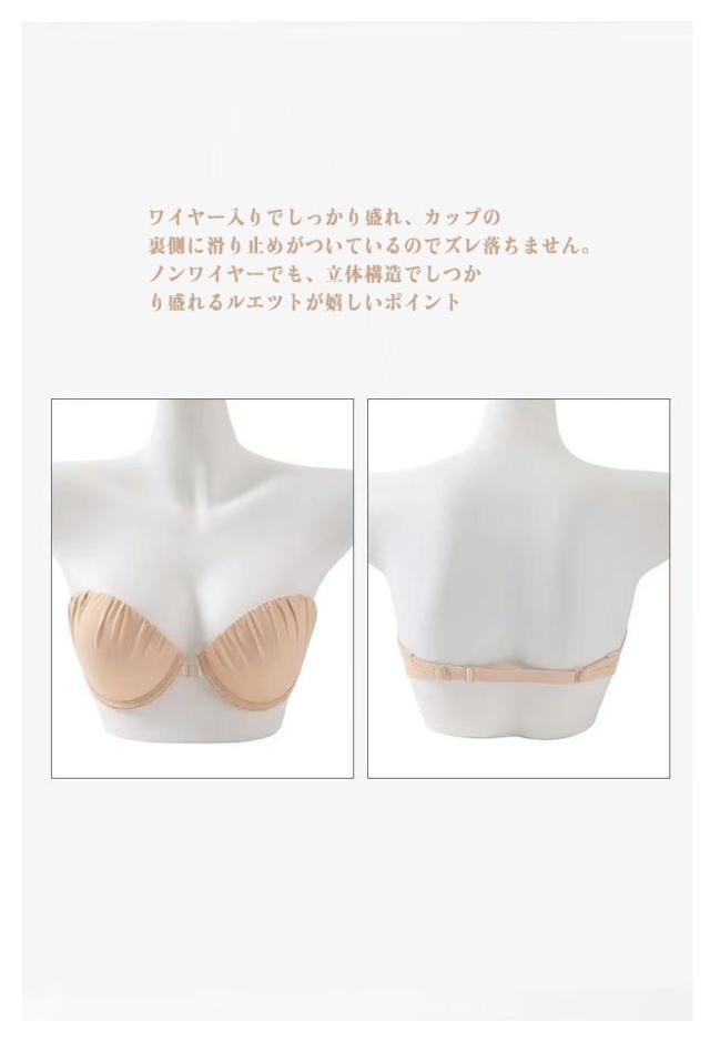 | オフショルダーなどの肌見せアイテム着用時に最適のブラジャー。 ワイヤー入りでしっかり盛れ、カップの裏側に滑り止めがついているのでズレ落ちません。 ノンワイヤーで嫌な締め付けはストレスなく、一日中楽々。ノンワイヤーでも、立体構造でしつかり盛れるルエツトが嬉しいポイント 通気性が良いので、長時間の使用でも蒸れを感じません。 無駄のない洗練されたデザインがボディラインに深みを与えてくれる | |