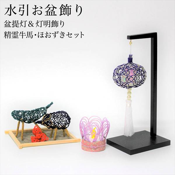盆飾り 水引盆帰郷 盆提灯 小・LEDローソク 藍白 精霊牛馬・ほおずき セット 台付き 「即日発送対応」 ( あすつく )