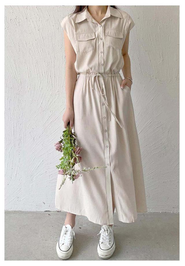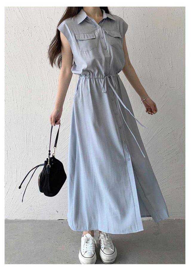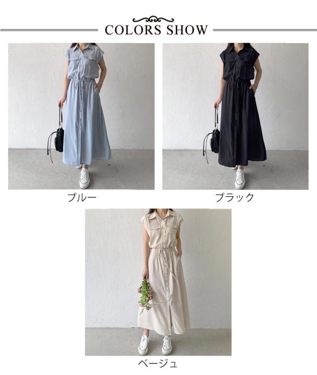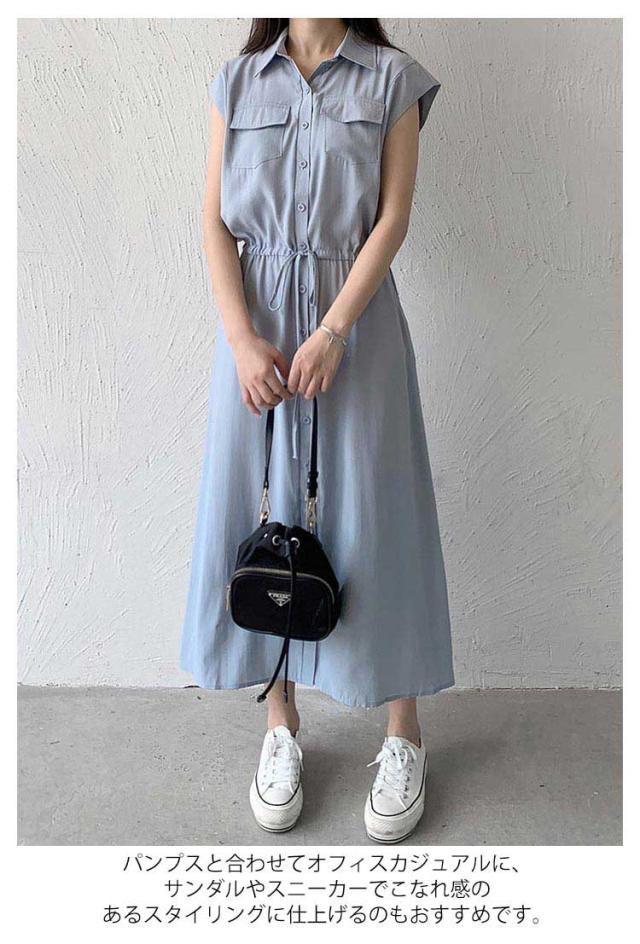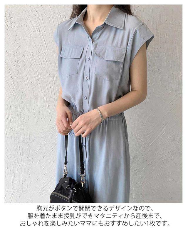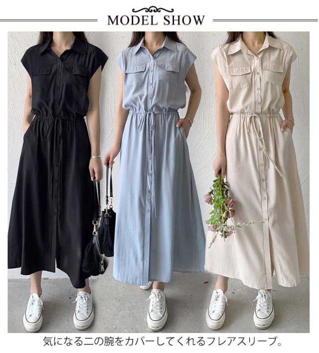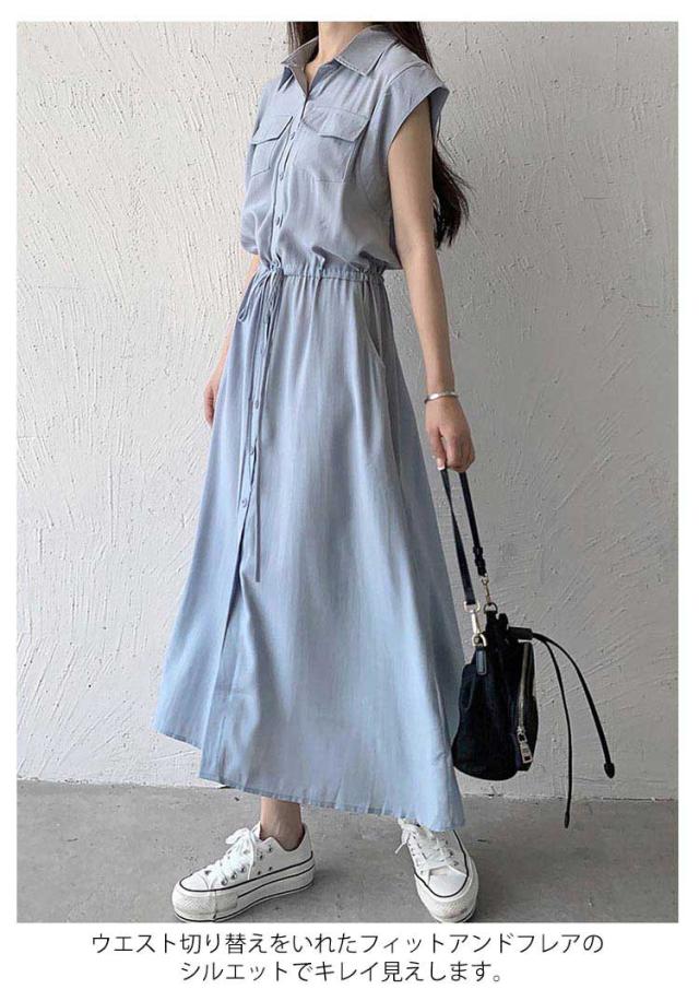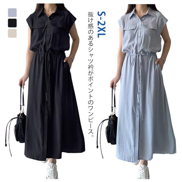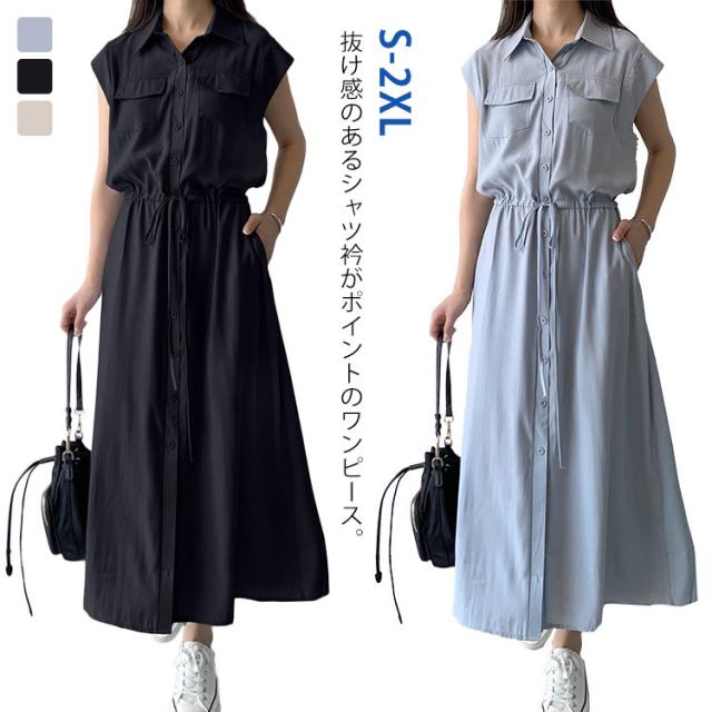 シャツワンピース レディース ロングワンピース ノースリーブ フレンチスリーブ ロングワンピース ロングシャツ シャツ ワンピ ロング マキシ マキシワンピース ボタン 前開 着痩せ フレア 大きいサイズ きれいめ カジュアル