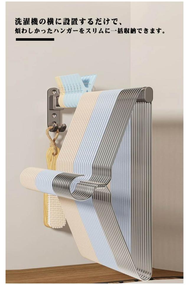 | 少しのスペースでハンガーや洗濯バサミをスッキリ収納できるハンガー収納フック 使わない時はハンガー部分を上に持ち上げて、収納することが出来ます。折りたたんだ状態でも下部にフックがあるので、ちょっとした小物を掛けられます。 折りたたんだ状態はとてもスリムなので、一見するとドアハンガーだとは気づきにくく、お部屋の雰囲気を邪魔しません。 洗濯機の横に設置するだけで、煩わしかったハンガーをスリムに一括収納できます。 洗濯物をその場でハンガーに掛けられるから本当に便利。 | |
