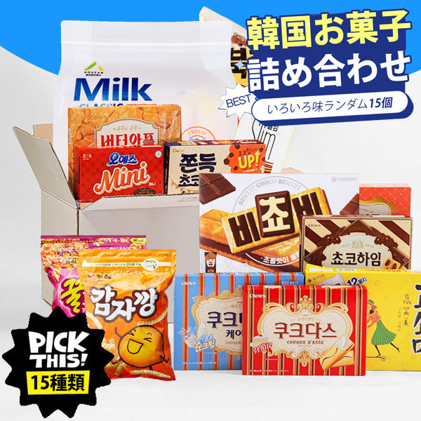 韓国のお菓子詰め合わせ15種類セットが登場!ビスケット、クッキー、チョコレートなど、韓国で人気のお菓子がランダムに15個入った特別なセットです。