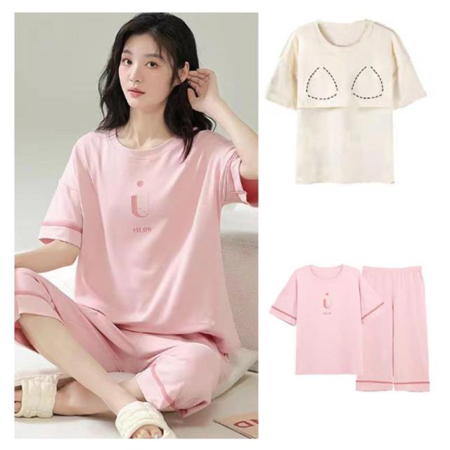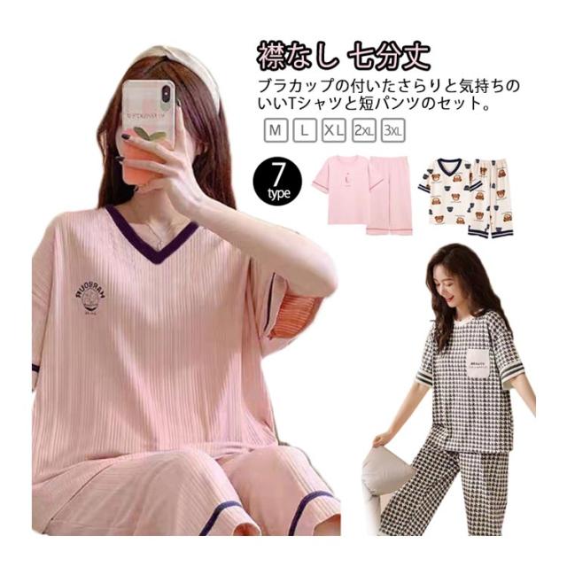 レディース 半袖 ルームウェア 夏 産後 夏用パジャマ 上下セット 大きいサイズ 大人用 パジャマ かわいい 半袖パジャマ 可愛いパジャマ 襟なし 春 カップ付き 丸首 パジャマ 七分丈 部屋着 入院 パッド付き かぶるだけ ゆったり チェック 部屋着 母の日