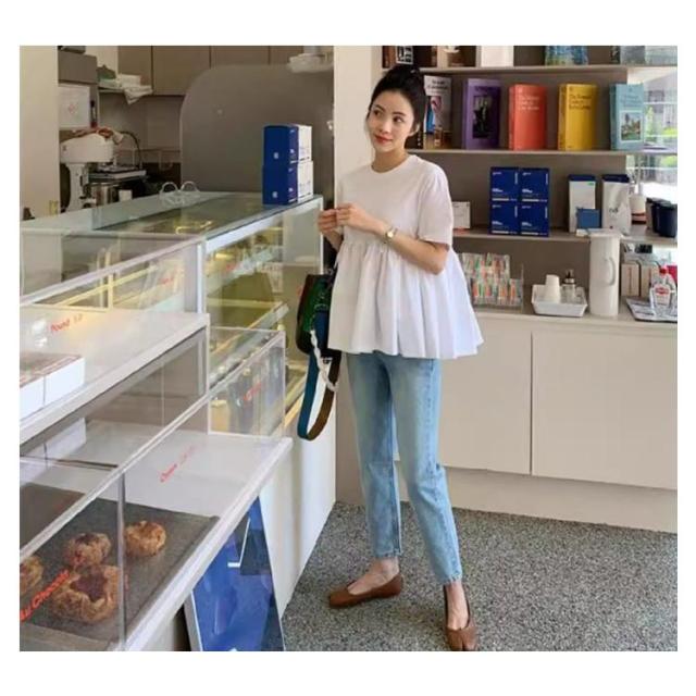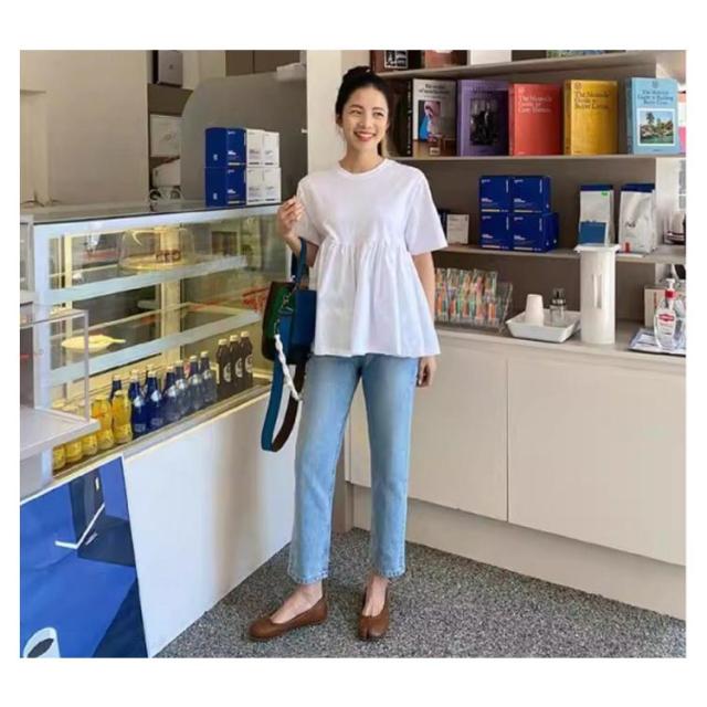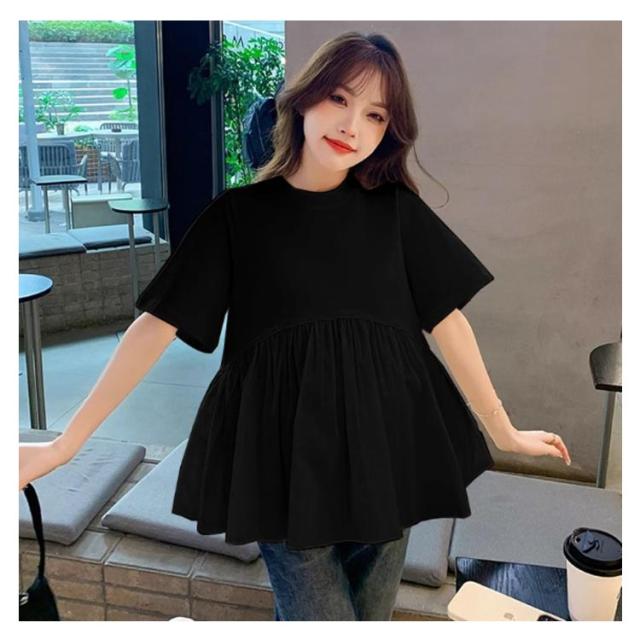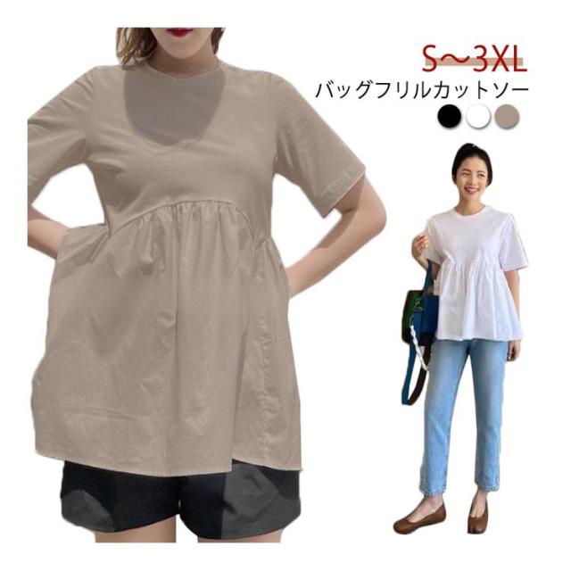 | バッグフリルカットソー S〜3XL Tシャツとブラウスの中間のようなカジュアルデザインです。 絶妙な丈感でお尻周りもふわっと体型カバー♪ あっさりした首回りでアクセサリーも映えること間違いなし! | |