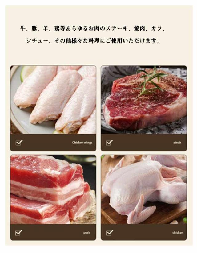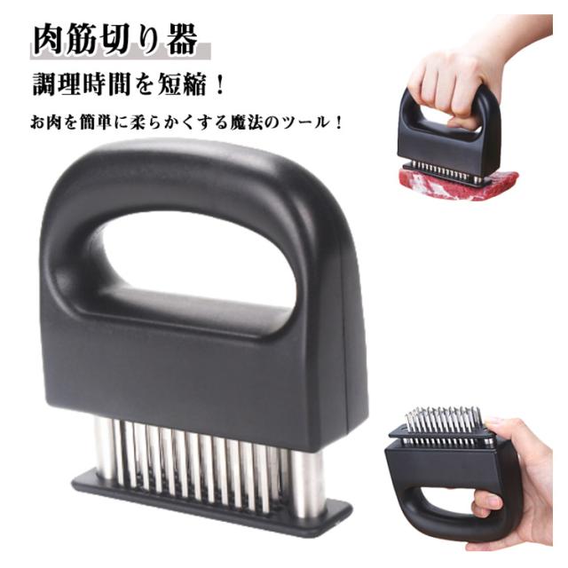 | 【肉筋切り器】 調理時間を短縮! お肉を簡単に柔らかくする魔法のツール! ステンレス刃とABSプラスチックを採用し、耐久性に優れている。 筋切り器を使うと肉が細かく切れ、調味料が染み込みやすいので、確かに肉が柔らかくジューシーになる。 特製の48本のステンレス刃が、風味、形を損なうことなくジューシーなお肉に大変身!。 グリップタイプなので、しっかりと握ることができるので扱いやすく便利です。 刃先のカバー部分は取り外すことが出来るので刃のお手入れも簡単です。 牛、豚、羊、鶏等あらゆるお肉のステーキ、焼肉、カツ、シチュー、その他様々な料理にご使用いただけます。 | |