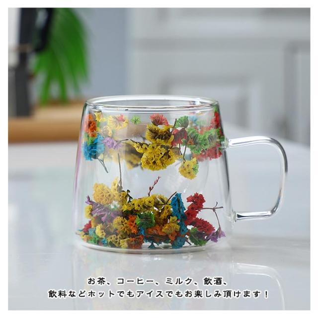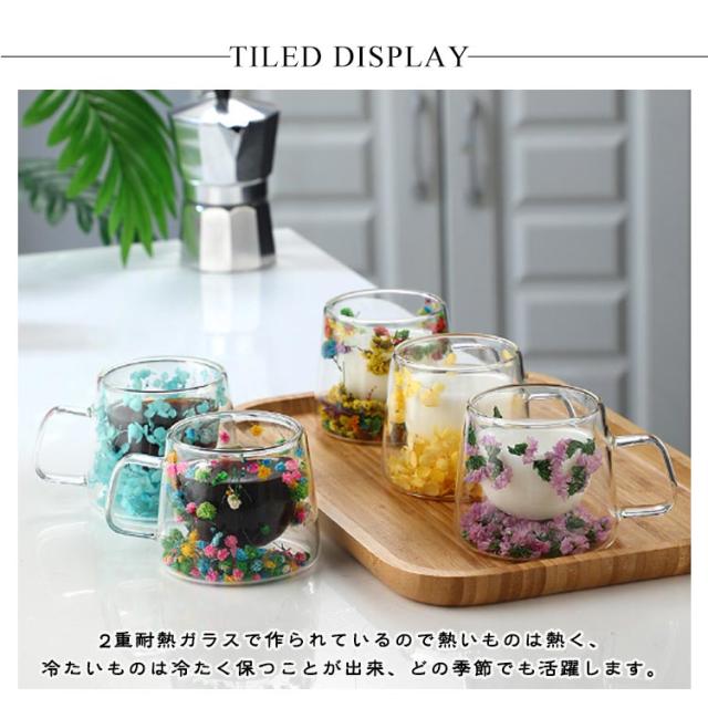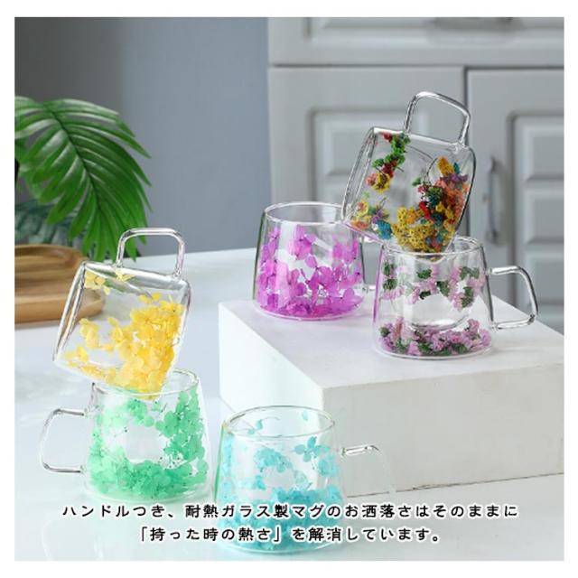 取っ手付き ガラスカップ 可愛い 真空断熱 きれいめ 耐熱ガラス 耐熱ガラス ドライフラワーグラスカップ 200ML 二重グラス ドライフラワー付き コーヒーカップ ティーカップ ガラスカップ 二重構造 かわいい ガラス