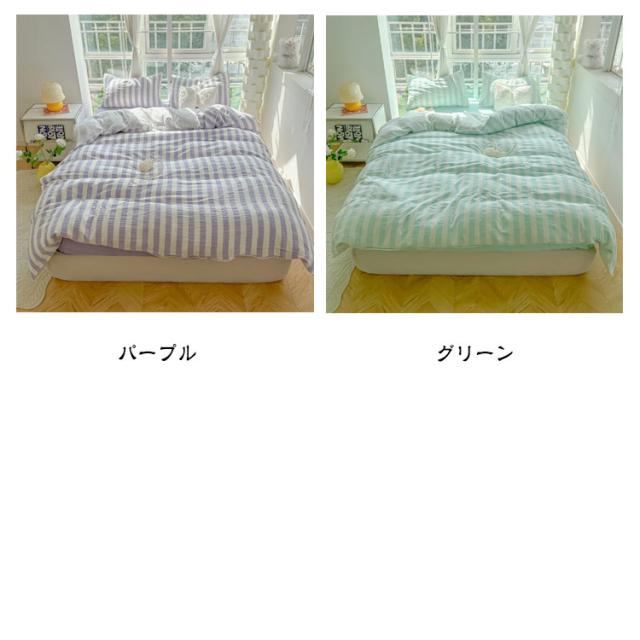 | ストライプデザインがお部屋に爽やかな印象を与えるベッドカバー3点セット。 薄手で、凸凹としたシワがあるのが特徴的な 布団カバーは着脱しやすいファスナーで、内側には紐止めが付いており、布団のずれを防ぎます。 枕カバーはファスナーなしで出し入れ簡単!! 上品なストライプがお部屋を一段とおしゃれにしてくれます。 お部屋の好みや雰囲気に合ったカラーを選べるカラー展開です! | |