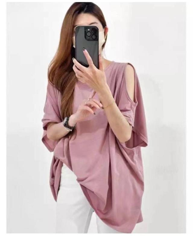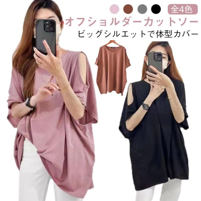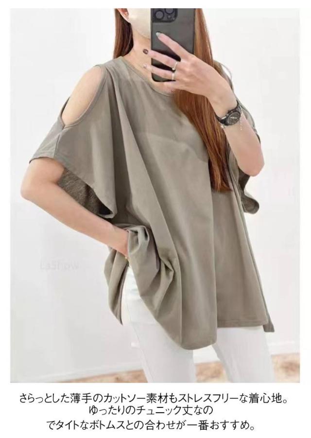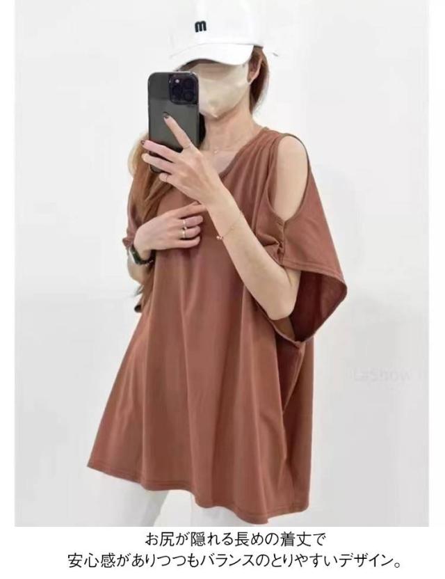 送料無料 半袖 オフショルダーTシャツ ゆったり トップス 夏新作 ラウンドネック ゆったり ドルマン tシャツ オフショルダー 肩出し ロングt ビッグシルエット 体型カバー