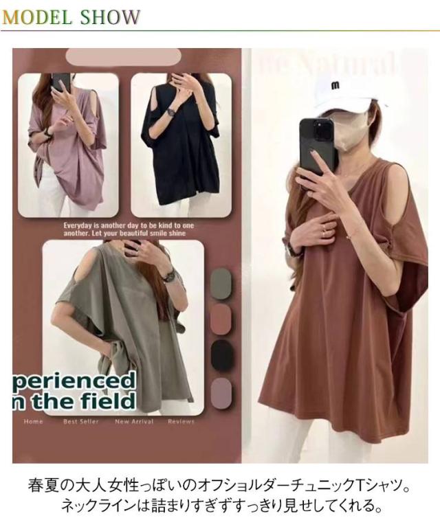 | 春夏の大人女性っぽいのオフショルダーチュニックtシャツ。 ネックラインは詰まりすぎずすっきり見せしてくれる。 お尻が隠れる長めの着丈で安心感がありつつもバランスのとりやすいデザイン。 腕周りもふんわりカバーしてくれます。 さらっとした薄手のカットソー素材もストレスフリーな着心地。 ゆったりのチュニック丈なのでタイトなボトムスとの合わせが一番おすすめ。 | |