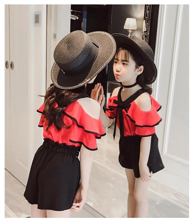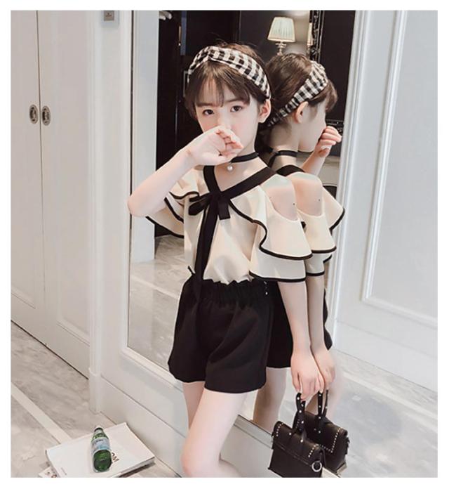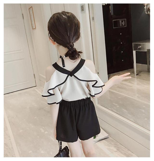 ショートパンツ 子ども服 大人っぽい セットアップ 肩出し フリルスリーブ トップス 夏 半袖 ブラック 夏服 モノトーン ブラウス キッズ ホワイト ジュニア 2点セット 上下セット 韓国 肩だし 韓国こども服 韓国子供服