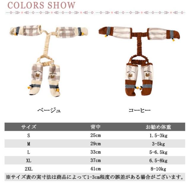| サイズについての説明 | 【S】背丈約25cm おすすめ体重1.5-3kg【M】背丈約29cm おすすめ体重3-5kg【L】背丈約33cm おすすめ体重5-6.5kg【XL】背丈約37cm おすすめ体重6.5-8kg【2XL】背丈約41cm おすすめ体重8-10kg※サイズは平置き実寸になります。 サイズ表の実寸法は商品によって1-3cm程度の誤差がある場合がございます。 |