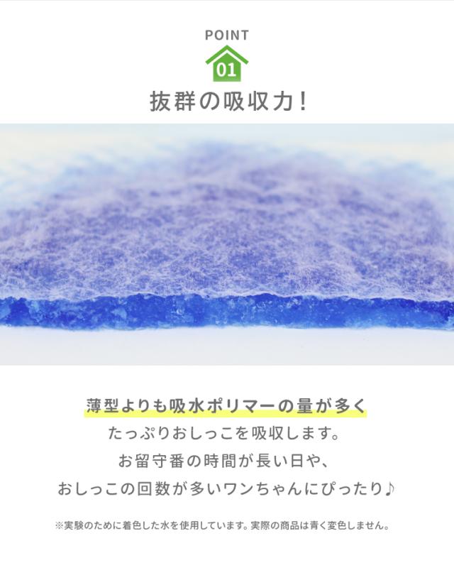 吸収材は通常薄型の3.8倍です。逆戻りしにくく、サイドからも底面からも漏れません。 ・強力プレス加工 ヨレ、破れに強い強力プレス加工 吸収材をたっぷり使用していても、強力プレス加工により、程よい厚みになっております。 ・エンボス加工 おしっこの広がりを抑えながら、ひっかき対策にもなります。 ・健康チェック 底面がさわやかな水色で、表裏が分かりやすくて、サッと敷くことができる 吸収面の色が真っ白で、おしっこの色で健康チェックもできます。 |