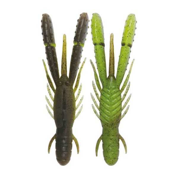 独自のスリットインパドルが水をつかみ、左右にブルブルと震えるライブリーアクションを発生。分厚いパドルの側面で水を叩く強い水押し波動と相まって、バスの本能を強烈に刺激します。ダディはスリットを湾曲させることで可動域を増やし、レスポンスを向上させました。また、上下のロッドワークでもしなやかにスイングし、ホッグ系特有のタテ方向の水押しでもアピール。上下左右の異なる刺激でバイトを頻発させます。フラットタイプのピンテールは着底後、パドルが倒れ込んだ後に左右にピリピリと震え、時間差による自発的アクションでポーズ中のバイトを促します。ダディは1対のみ異形状のレッグを設けることで、アクションと波動を複雑にし、バスに見切らせにくくする効果を高めました。レッグとは逆向きに設けた1対の逆手は、フォールスピードにブレーキをかけつつハイピッチにバイブレーションし、サスペンドバスのバイトを促します。比重は、自然な水中姿勢と強い水押しを兼備する塩の含有量を吟味。エビ・イカ・ベイトフィッシュの粉末をトリプル配合。