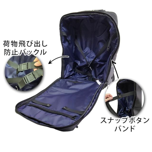 メイン:ファスナーポケット×1、荷物固定バンド、荷物飛び出し防止サイドストラップ付属