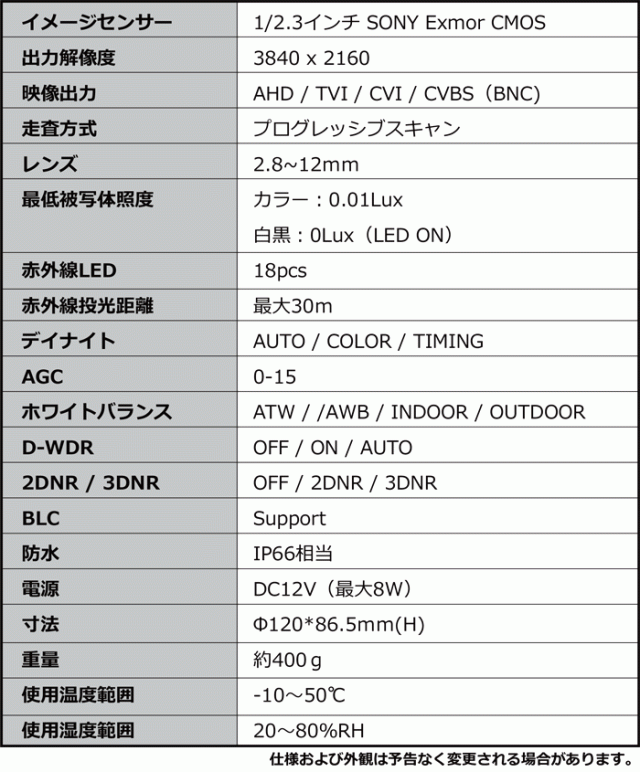 ・仕様及びデザインは予告なく変更される場合がございます。予めご了承ください。・カメラ部の映像出力は、AHD方式・CVBS(アナログ)出力切替に対応します。AHD出力は、AHD方式採用の業務用モニターや、コンバーター録画機と組み合わせてご使用下さい。