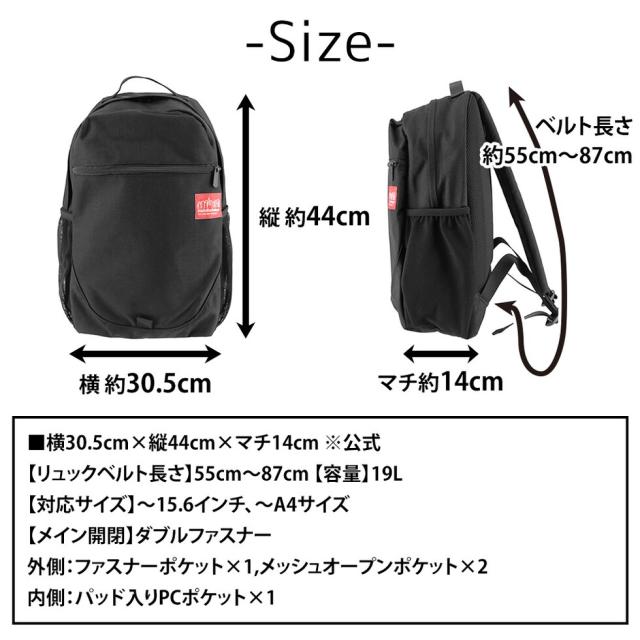 | サイズ(約) ※当店実寸値 | 公式サイズ 横30.5cm×縦44cm×マチ14cm 【リュックベルト】55cm〜87cm 【容量】19L 【対応サイズ】〜15.6インチ、〜A4サイズ | ||