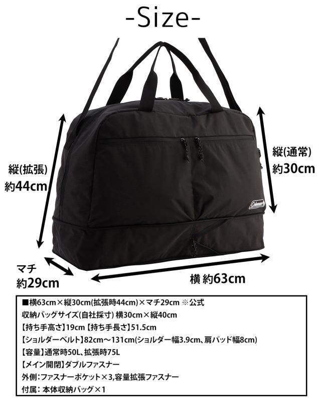 | サイズ(約) ※当店実寸値 | 公式サイズ 横63cm×縦30cm(拡張時44cm)×マチ29cm 収納バッグサイズ(自社採寸) 横30cm×縦40cm 【持ち手高さ】19cm 【持ち手長さ】51.5cm 【ショルダーベルト】82cm〜131cm(ショルダー幅3.9cm、肩パッド幅8cm) 【容量】通常時50L、拡張時75L | ||