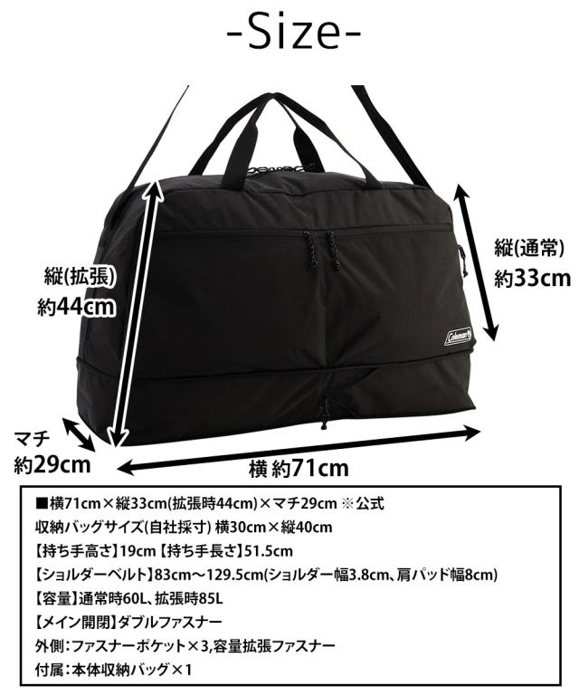 | サイズ(約) ※当店実寸値 | 公式サイズ 横71cm×縦33cm(拡張時44cm)×マチ29cm 収納バッグサイズ(自社採寸) 横30cm×縦40cm 【持ち手高さ】19cm 【持ち手長さ】51.5cm 【ショルダーベルト】83cm〜129.5cm(ショルダー幅3.8cm、肩パッド幅8cm) 【容量】通常時60L、拡張時85L | ||
