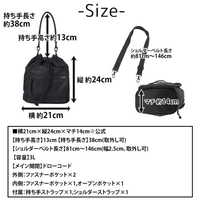 | サイズ(約) ※当店実寸値 | 公式サイズ 横21cm×縦24cm×マチ14cm 【持ち手】高さ13cm、長さ38cm(取外し可) 【ショルダーベルト】81cm〜146cm(幅2.5cm、取外し可) 【容量】3L | ||