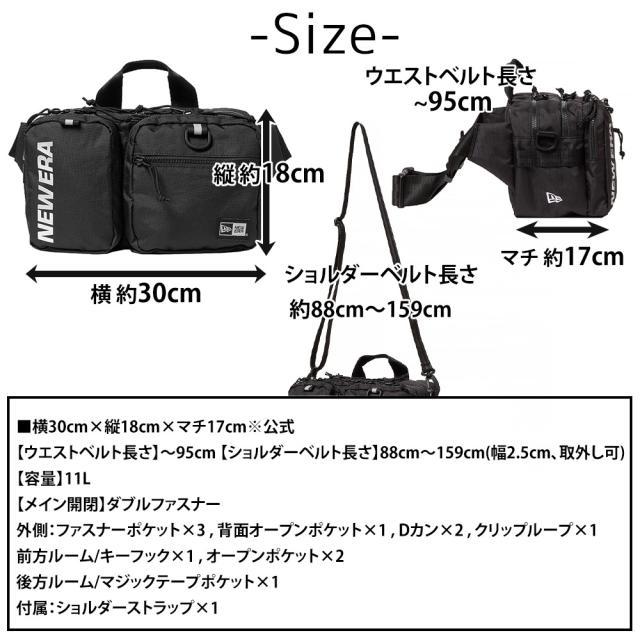 | サイズ(約) ※当店実寸値 | 公式サイズ 横30cm×縦18cm×マチ17cm 【ウエストベルト長さ】〜95cm 【ショルダーベルト長さ】88cm〜159cm(幅2.5cm、取外し可) 【容量】11L | ||