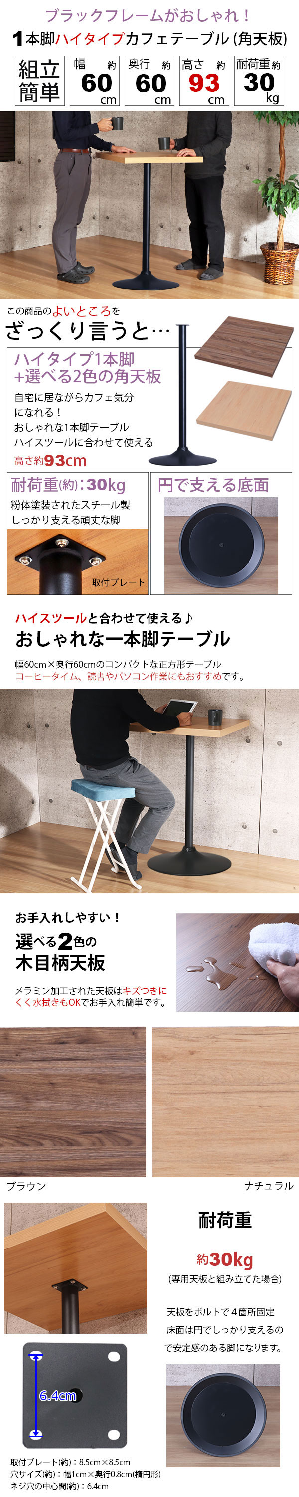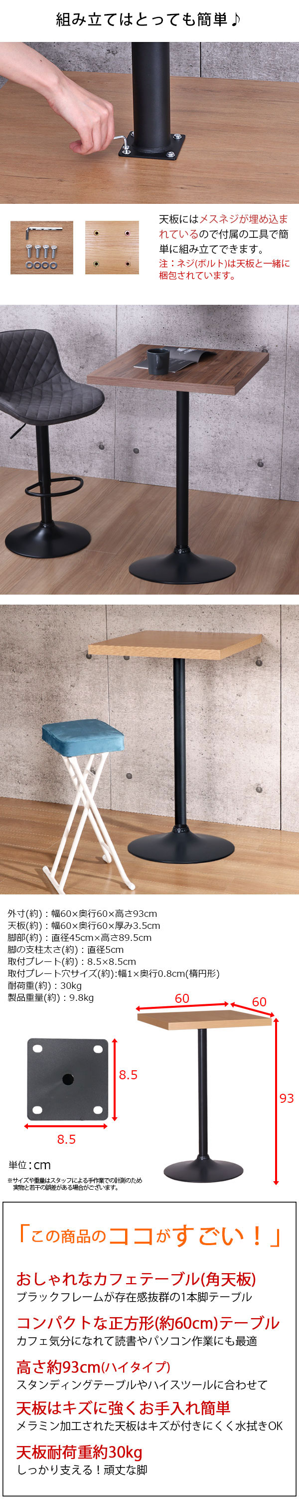 カフェテーブル ハイタイプ 正方形 60×60 一本脚 カウンターテーブル カフェ風 テーブル おしゃれ ハイテーブル サイドテーブル パソコンテーブル ワークテーブル コンパクト ブラックスチール脚 丸ベース 幅60cm 奥行60cm 高さ93cm ブラウン ナチュラル アジャスター付き