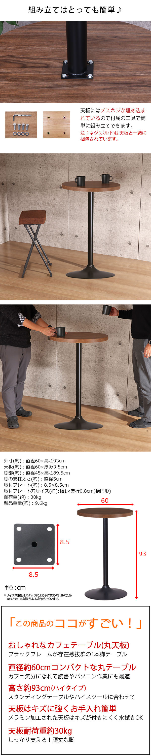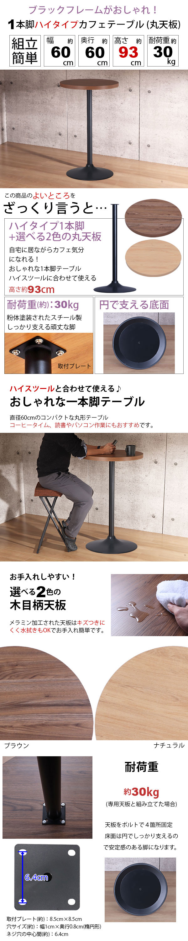 商品名:カフェテーブル ハイタイプ 丸 60×60 一本脚 カウンターテーブル カフェ風 テーブル おしゃれ ハイテーブル 丸テーブル サイドテーブル パソコンテーブル 作業机 コンパクト ブラックスチール脚 丸ベース 幅60cm 奥行60cm 高さ93cm ブラウン ナチュラル アジャスター付き 家具 インテリア テーブル 机 1本脚 背の高い机 パソコンデスク PCデスク ラウンドテーブル ワークテーブル 在宅勤務 リモートワーク テレワーク ソファテーブル サークルテーブル ディスプレイテーブル 飾りテーブル 木製 新生活 一人暮らし ワンルーム リビング オフィス 店舗 ショップ 飲食店 カフェ コインランドリー サロン 寝室 玄関 ソファサイド ソファ横 ベッドサイド ベッド横 シンプル モダン スタイリッシュ かっこいい シック かわいい お手入れ簡単 水に強い 傷に強い 木目調 組み立て簡単 おうちカフェ