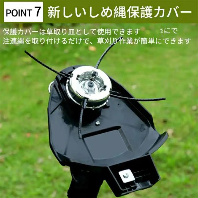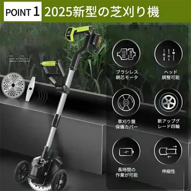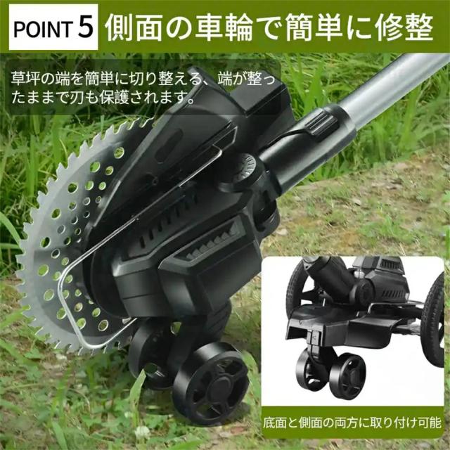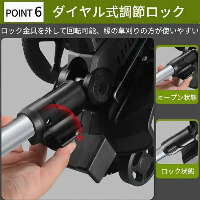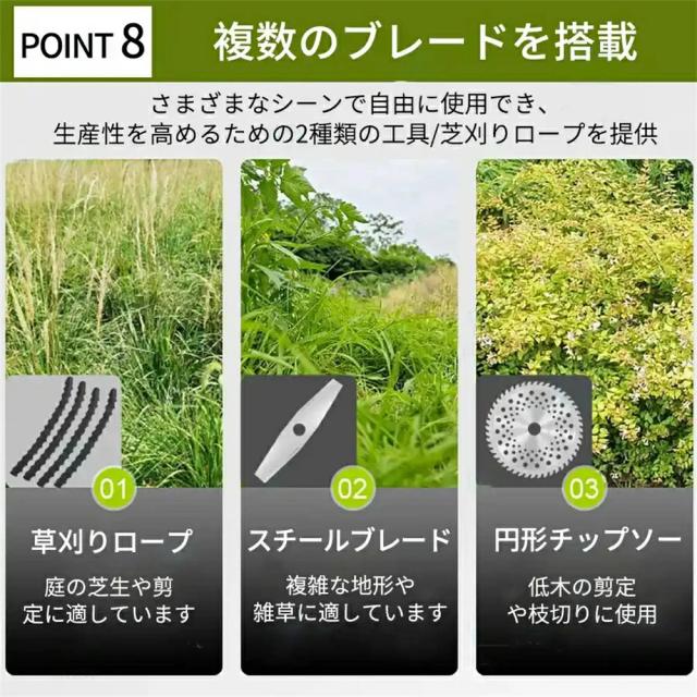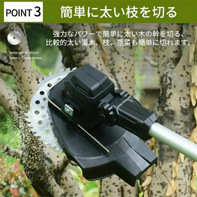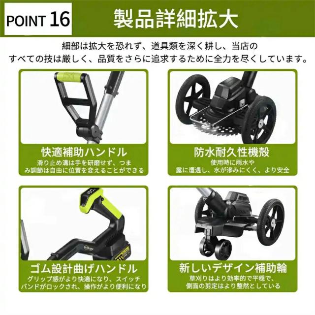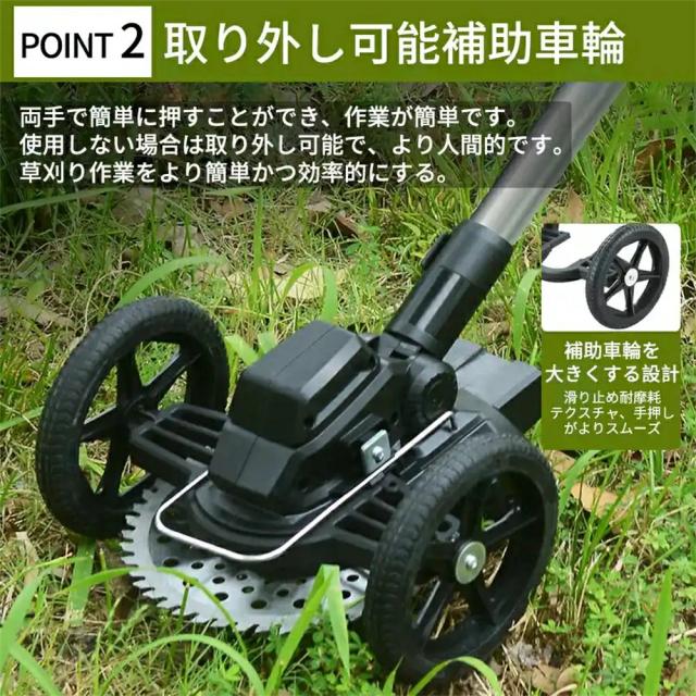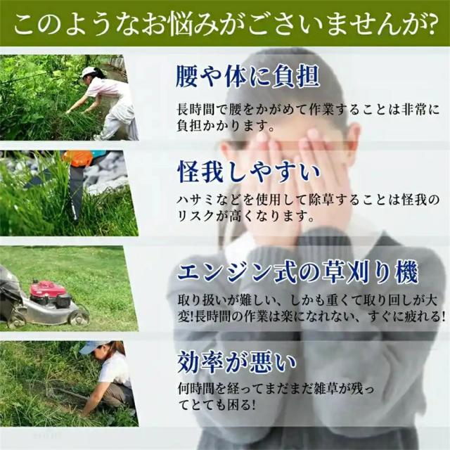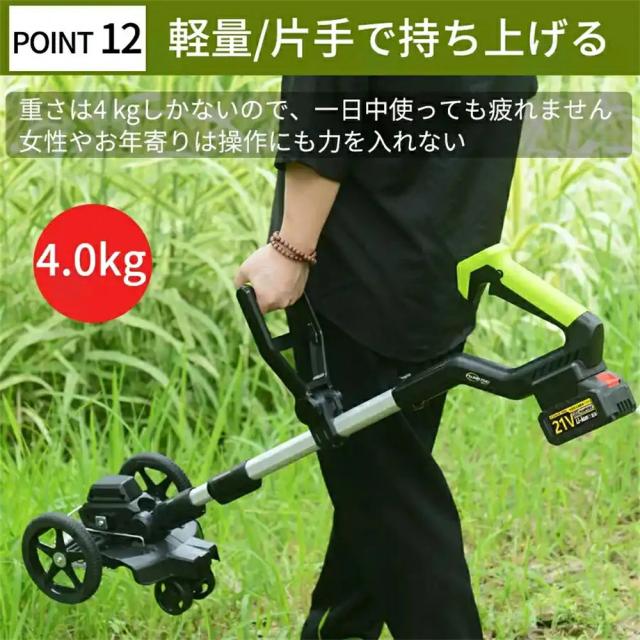 演園芸・DIY用途で人気の電動式草刈機。体重量わずか4kg、軽量で使いやすく、力の弱い女性やお年寄りでも簡単に扱えます。コードレスなので使いは便利です。大容量バッテリー、近くに電源がなくても使用できます。高品質純銅モーターを採用し、出力は毎分40000rpmの大出力により、草刈り効率は一層向上することができます。庭に生えた雑草の手入れなどの日常用途に最適。使用面を考えて、ロックと保護カバーを搭載。有効に誤操作防止、作業時の草や小石飛散防止になります。取り付け簡単!刃の交換はたった5分で完了します!どんな年齢層の方でも簡単に取り付けできる設計となっています。