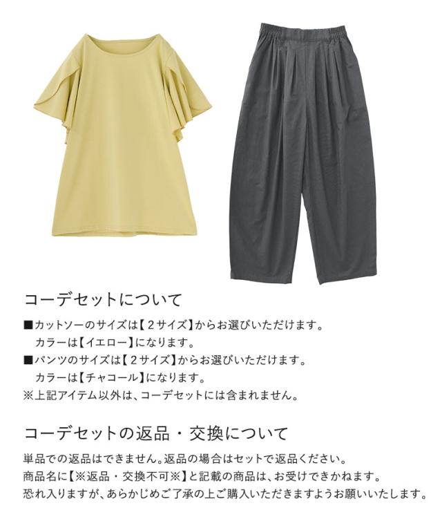 カットソー Tシャツ 半袖 トップス フレアスリーブ コットン混 綿混 二の腕カバー 着回し クルーネック カジュアル きれいめ 上品 春 夏 レディース プルオーバー 大人女子 大人可愛い お洒落可愛い 大人カジュアル ベーシック ニュアンス ラフ エフォートレス オフィスカジュアル ナチュラル 袖コンシャス ミディ丈 ミドル丈 フリル 無地 おうちで洗える シンプル キレカジ フェミニン ガーリー 可愛い系 ゆったり ゆる 楽ちん Sサイズ Mサイズ Lサイズ LLサイズ 3Lサイズ XLサイズ ぽっちゃり 体型カバー 大きいサイズ プラスサイズ 10代 20代 30代 40代 50代 60代 女子会 通勤 通学 パンツ ボトムス タック ロング 吸水速乾 接触冷感 バレル ひんやり 綿麻混素材 風合い 薄手 ロングパンツ ロング丈 ポケット 冷感 涼しい オフィス・ビジネス スポーティ ストレスフリー 動きやすい 低身長 高身長 イエロー 黄色 チャコール 202506 2点セット プレゼント 福袋 コーディネートセット コーデセット 中身が見える福袋 上下セット ギフトセット[ID]12cn13q