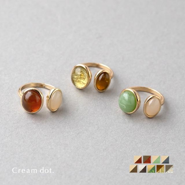 ぷっくりとしたダブルストーンを飾ったオープンリング。マーブル/ルチルクォーツ風のモチーフが手元にこなれ感をプラスします。それぞれニュアンスのある大人カラーで手元コーデの主役にぴったり。