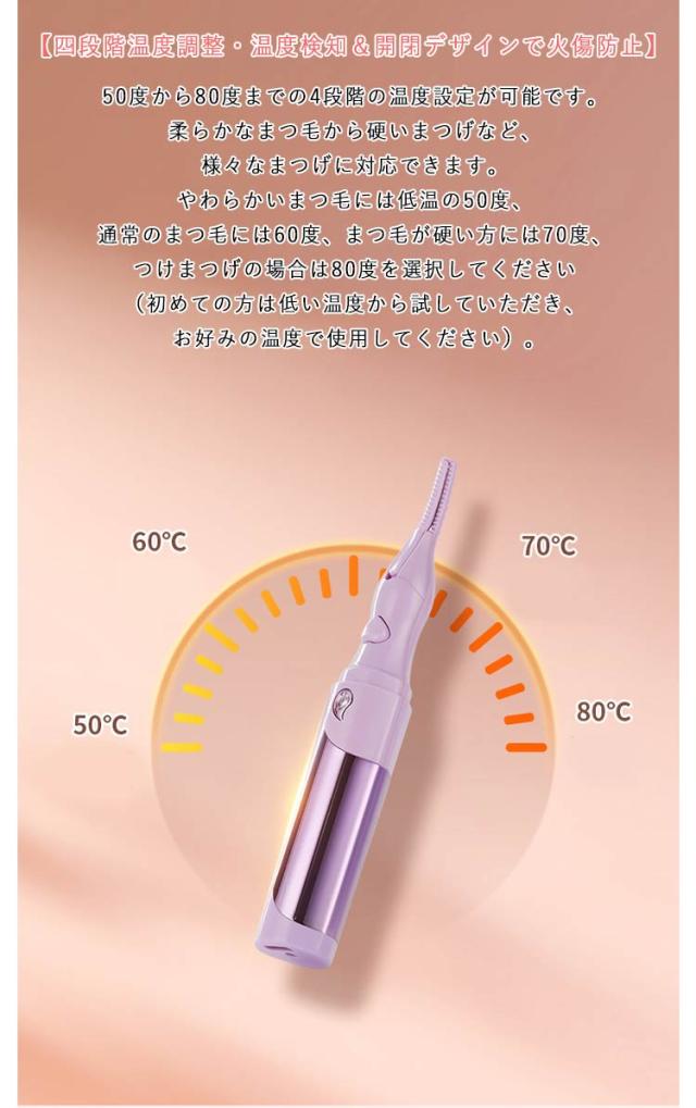 | 温度見える液晶ディスプレイ付き!この小型ホットビューラーで、初心者でも、ご自宅でまつげをより自然でより長持ち美しいカール、忙しい朝でもばっちりまつ毛美人になります。マスカラと併用しでキープ力をさらにカールアップさせることができます。 【四段階温度調整・温度検知&開閉デザインで火傷防止】 50度から80度までの4段階の温度設定が可能です。柔らかなまつ毛から硬いまつげなど、様々なまつげに対応できます。やわらかいまつ毛には低温の50度、通常のまつ毛には60度、まつ毛が硬い方には70度、つけまつげの場合は80度を選択してください(初めての方は低い温度から試していただき、お好みの温度で使用してください)。温度検知付き、最初のパープルからピンクに変わると使用できるか一目でわかり、触ってやけどをしてしまったことを防止できます! 【type-C充電式&自動OFF機能】 電池式から便利なtype-C充電式のホットビューラーに変更して外出先や充電できない場所でも使用できます。また、電源を入れてから約10分後に自動的に電源がOFFになるため、万が一電源を切り忘れたとしても心配なし、安全性が高いです! 【使いやすい・お手入れ簡単】 操作簡単:2秒押すでホットビューラーの電源オン/オフ、温度調節など様々な操作が対応できます。急速予熱:電源を入れて約20秒ぐらい温まります(温度検知はピンクに変わればOK)。 | |