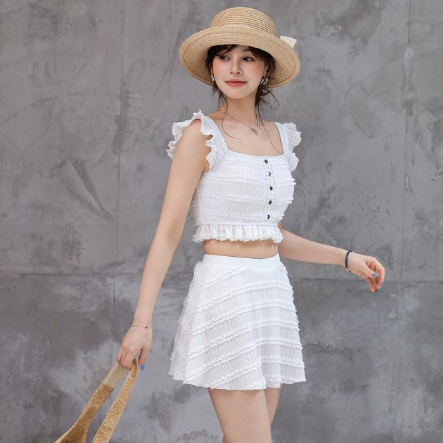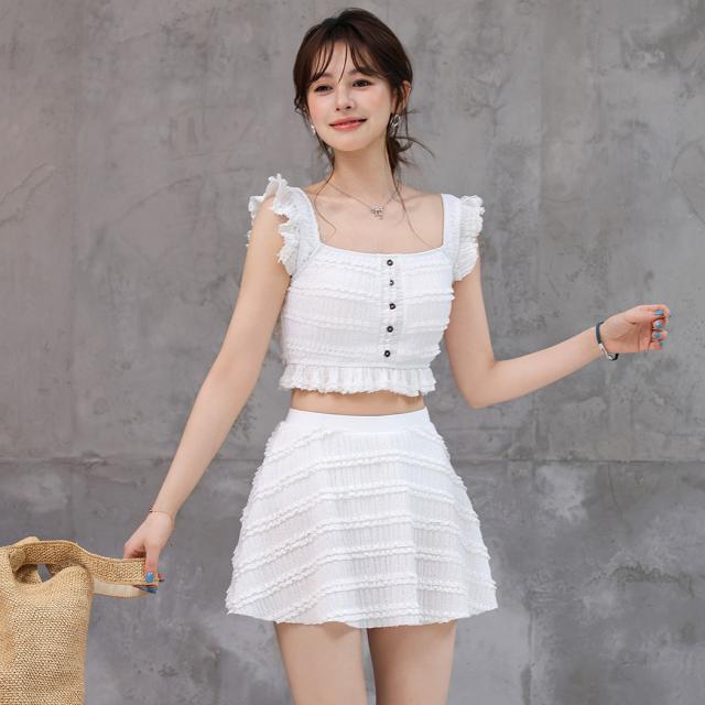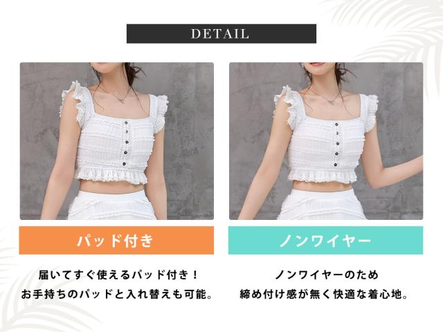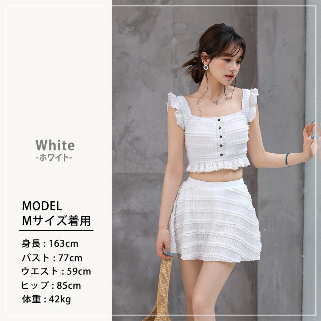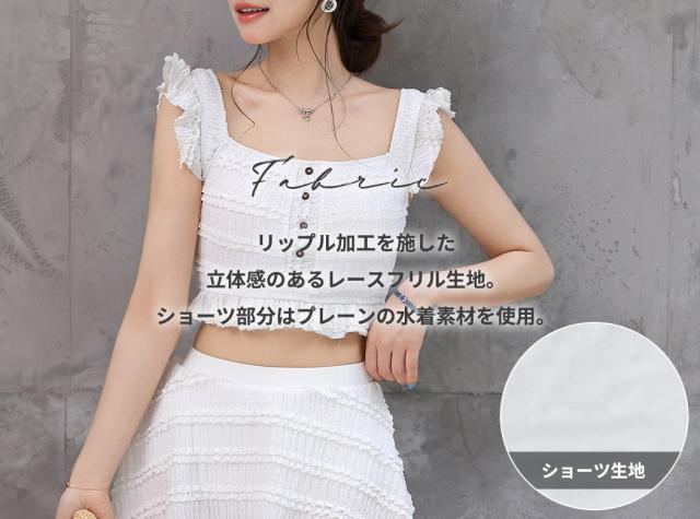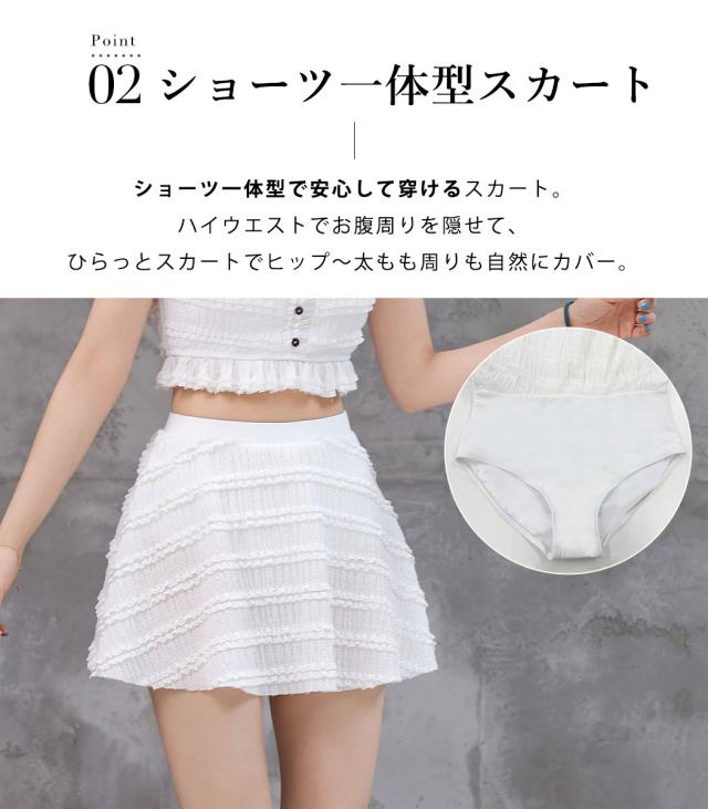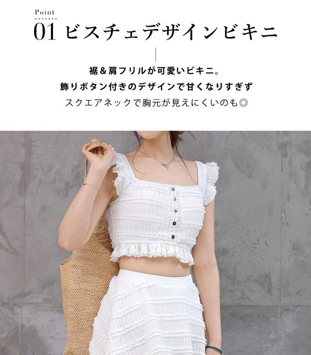 水着 ビスチェビキニ レディース 体型カバー セパレート 2点セット ブラ スカート リップル加工 スクエアネック 肩フリル 裾フリル レース ハイウエスト ノンワイヤー パッド付き バスト 盛れる ウエスト ヒップ お尻 太もも カバーアップ 白